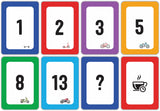 Our standard Planning Poker deck is a 6 player deck containing 6 sets of the following 9 cards, totalling 54 cards in a pack: 1, 2, 3, 5, 8, 13, 21, ? and Coffee card.
