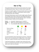 Our deck consists of 14 themes / areas for the teams to discuss and 6 sets of 3 traffic light cards to enable the team members rate the cards based on their perception of how the team is performing in each area. The goal is to spark discussion and reflection on areas where the team can improve and to celebrate strengths.