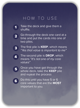 The Core Values Cards are designed to help you reflect on your values and act consciously in line with them. Work towards greater focus on your most critical values so you can clarify decisions, and choose outcomes that matter.