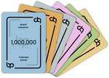 This 6 player deck contains 84 poker sized cards: 6 sets of the following 14 cards: 0, 500, 1,000, 5,000, 10,000, 25,000, 50,000, 100,000, 250,000, 500,000, 750,000, 1000,000, ? and infinity. A comprehensive set created by Allan Kelly to enable teams assess the business value of user stories.